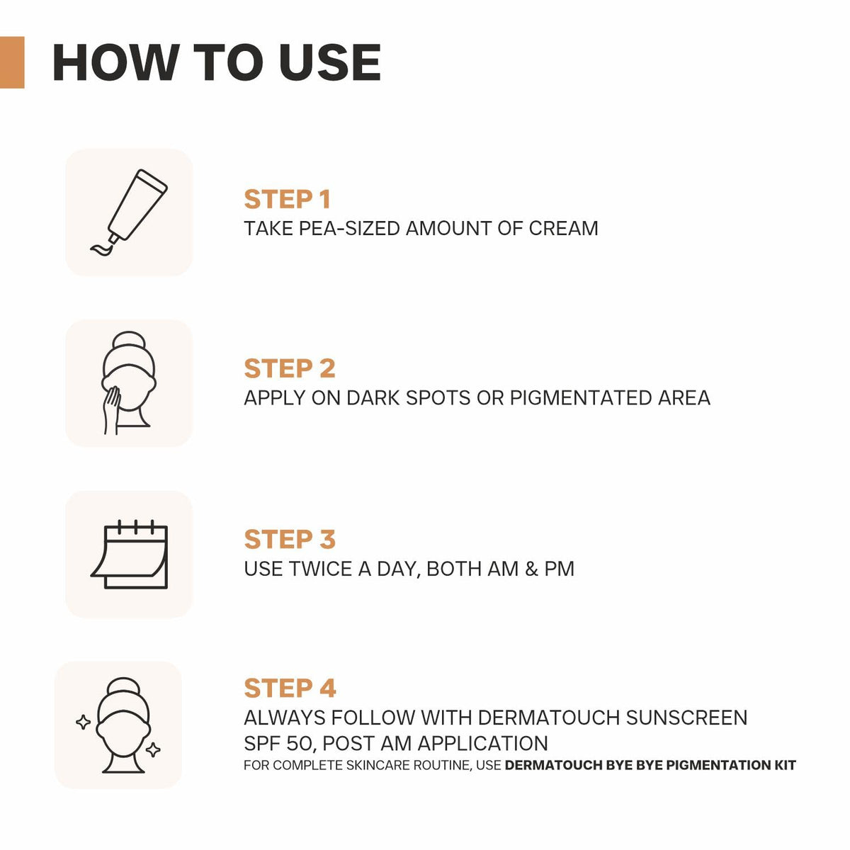 Dermatouch Bye Bye Pigmentation Cream helps to effectively lighten pigmentation, blemishes and dark spots.