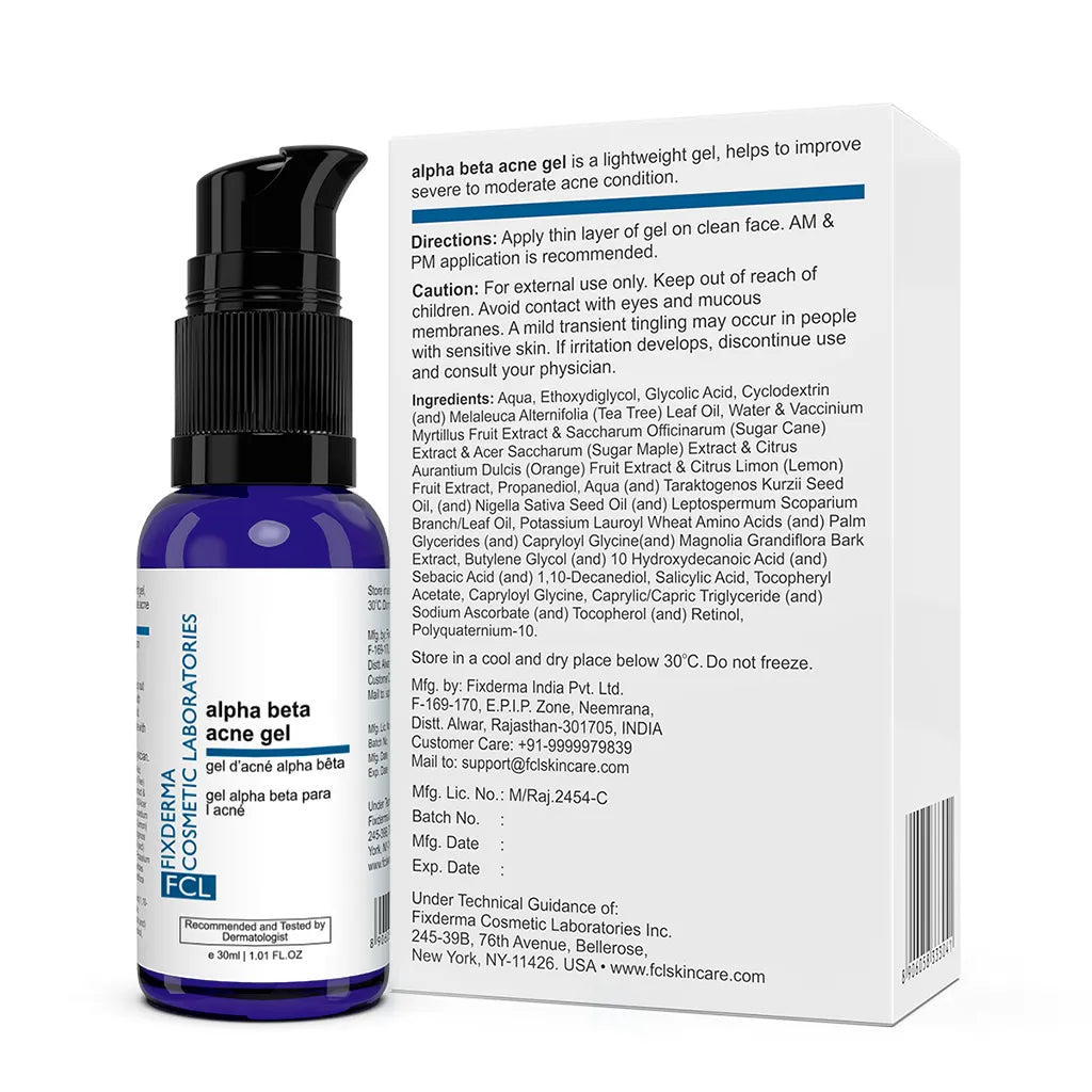 FCL Alpha Beta Acne Gel is a pore-refining facial gel designed to treat acne by exfoliating dead skin cells and unclogging pores. Ideal for oily, acne-prone skin, it regulates oil production, prevents new breakouts, and reduces blemishes. Key ingredients include Glycolic Acid, Tea Tree Oil, Multi Fruit Natural AHA, Salicylic Acid, and Retistar for comprehensive acne care.