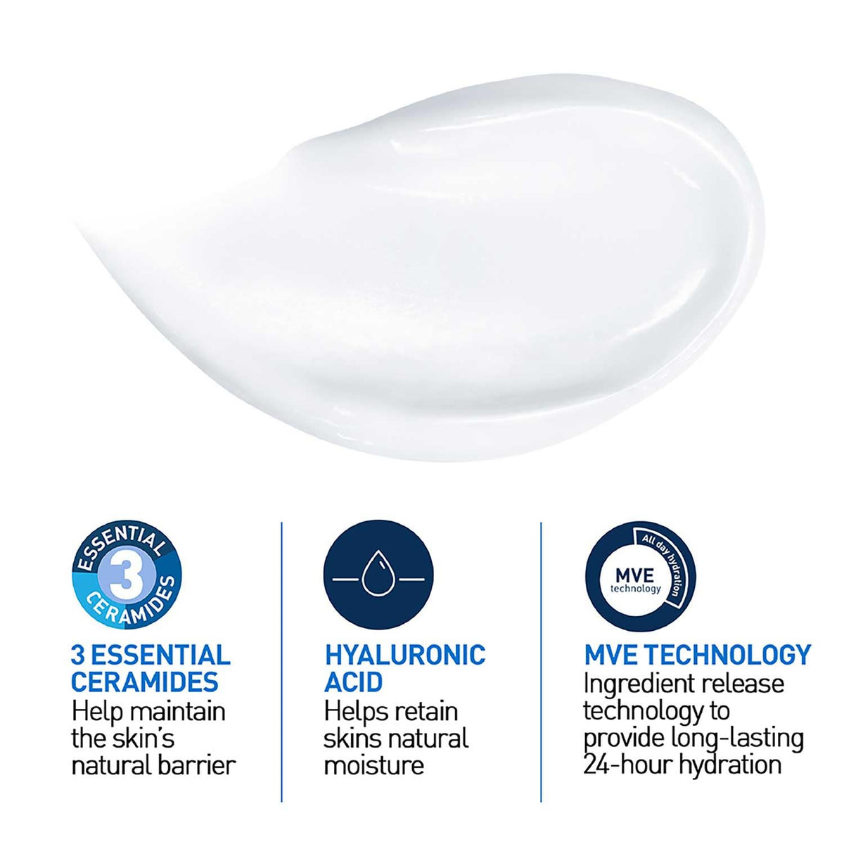CeraVe Moisturizing Cream includes three essential ceramides and hyaluronic acid to effectively hydrate the skin and restore the skin’s protective barrier. Developed with dermatologists and suitable for dry and very dry skin on the face and body, this rich, non-greasy, fast-absorbing moisturizing cream features our patented MVE Delivery Technology to release a steady stream of moisturizing ingredients throughout the day and night. CeraVe Moisturizing Cream with ceramides is fragrance free.
