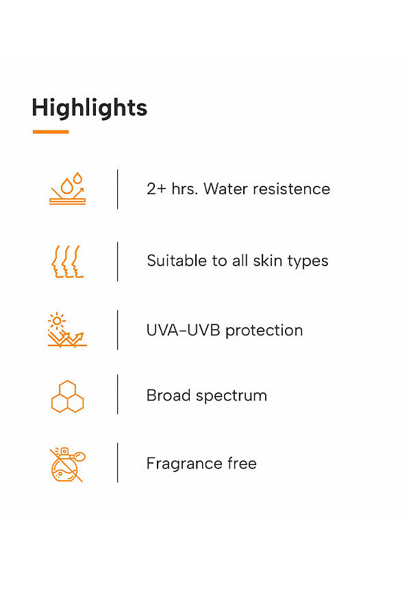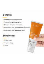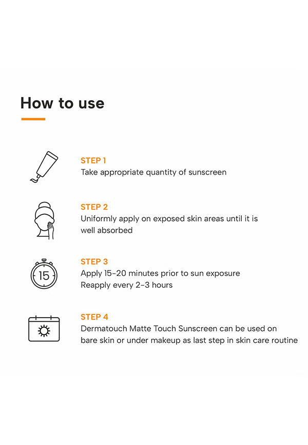Dermatouch Matte Touch Sunscreen provides a broad spectrum of 50 SPF, PA+++ and certified 120+ minutes water resistance that is perfect for outdoor activities. This sunscreen is formulated with clinically proven actives, is fragrance free, water/sweat resistant with both UVA-UVB and blue light protections.
