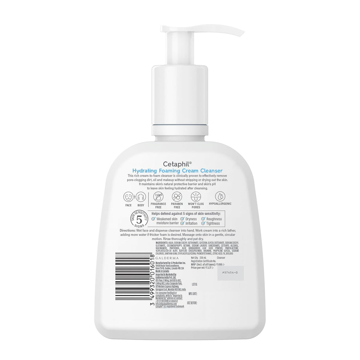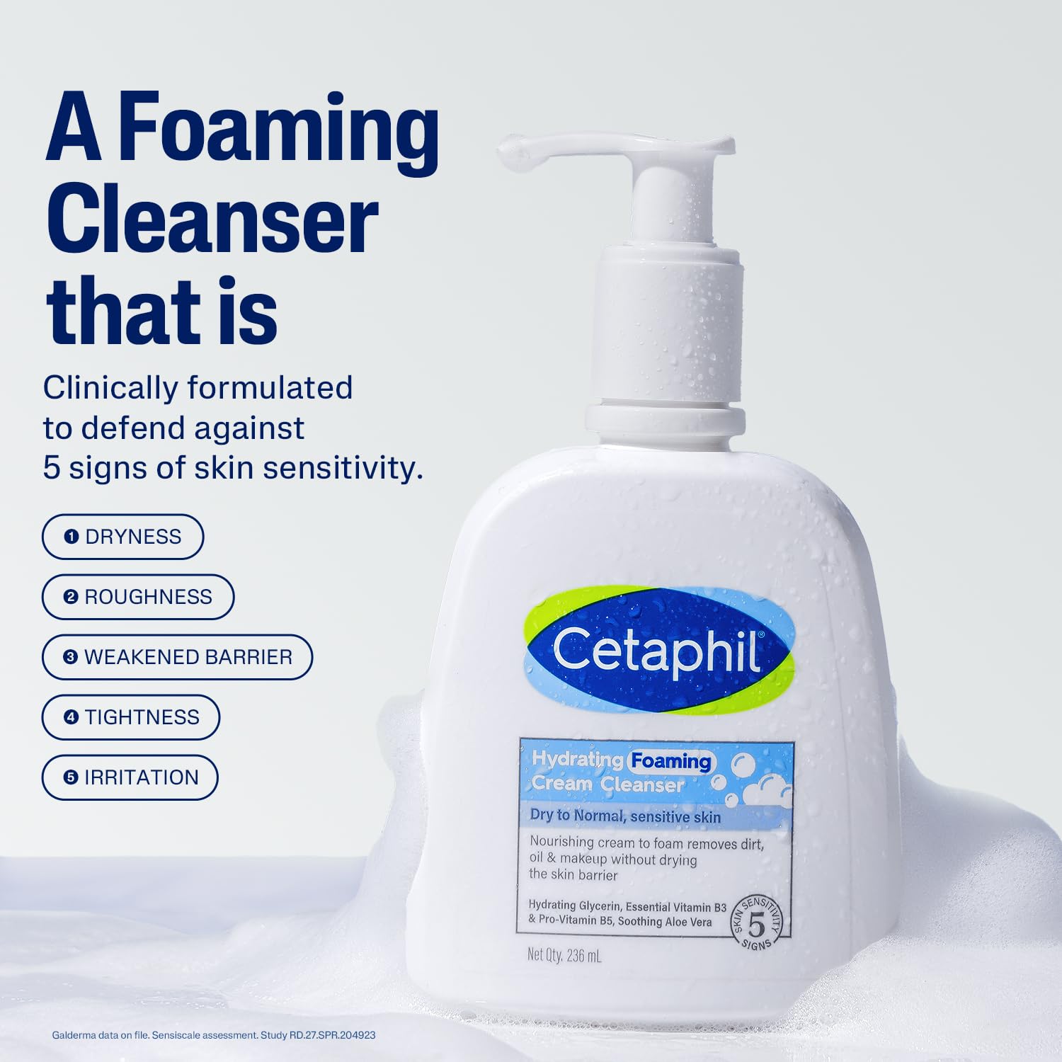 • The Cetaphil Hydrating Foaming Cream Cleanser is a nourishing face wash that transforms from cream to foam. It's designed for dry to normal, sensitive skin and effectively removes dirt, oil, and makeup while preserving the skin's natural moisture barrier. Formulated with prebiotic aloe, vitamins B3 and B5, and hydrating glycerin, it maintains the skin's natural pH and leaves it feeling hydrated and soothed. The cleanser is free from parabens, fragrance, and oil, and is hypoallergenic, making it suitable for sensitive skin.