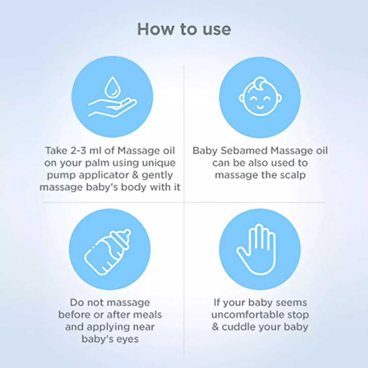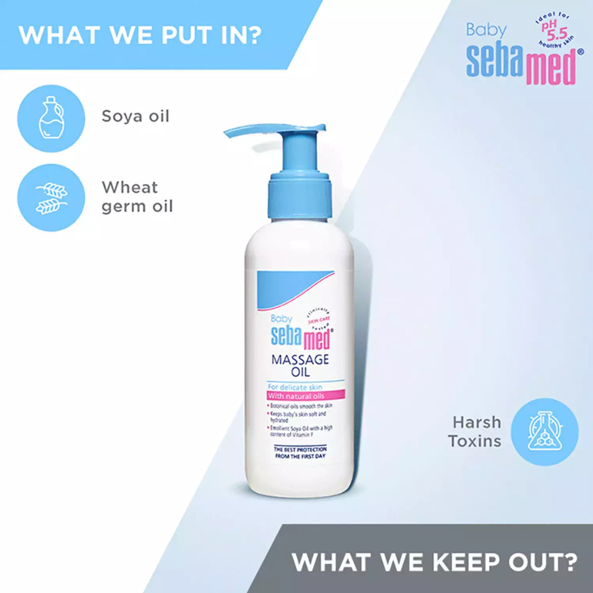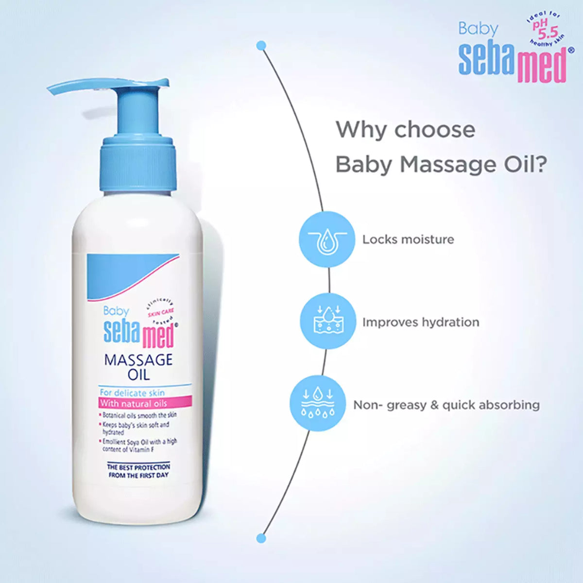 Sebamed baby oil smoothness the baby's skin to give her a peaceful and relaxing feeling.Healthy skin has a biological slightly acidic surface called the acid mantle. The delicate skin of a newborn is lacking this protective acid mantle, which is established during the first few months of life. Sebamed Baby Massage Oil helps in quickly developing this layer which protects the baby's gentle skin from the dust and heat she encounters in the early days after birth.