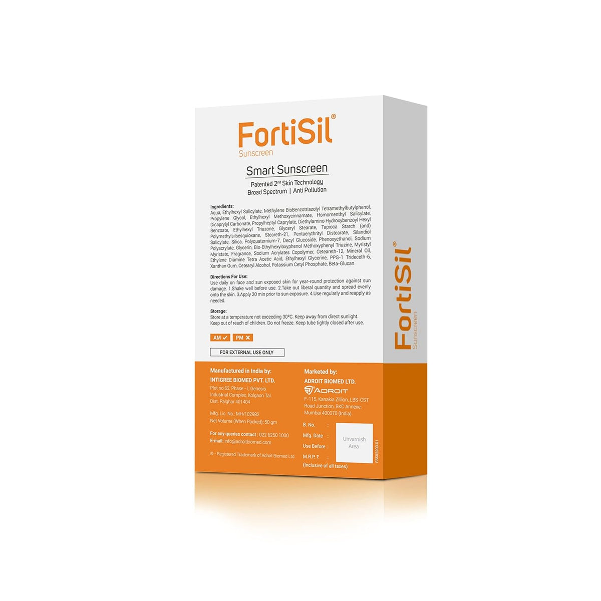 Fortisil Smart Sunscreen Ultra Matte Gel SPF 50 PA+++ is a high-performance sunscreen formulated with patented second skin technology, offering broad-spectrum UVA and UVB protection. Its ultra-matte, dry-touch gel texture ensures a non-greasy finish, making it ideal for daily use. The inclusion of Hydrasensyl Glucan soothes the skin and reduces UV-induced redness, while the anti-pollution effect minimizes pollutant adhesion, providing comprehensive skin defense and protection.