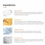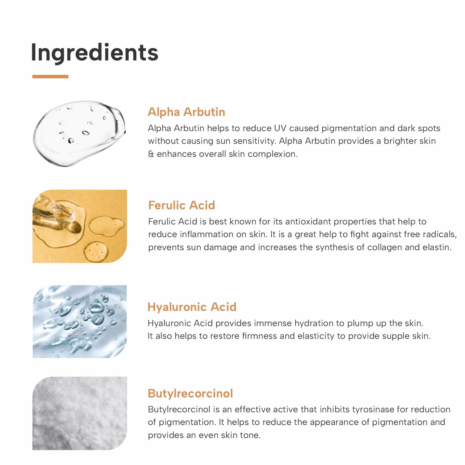 With added Ferulic Acid, Hyaluronic Acid & Butyroctanolin, this serum offers a double layered protection against skin barrier damages, fades spots, moisturizes and evens out skin.