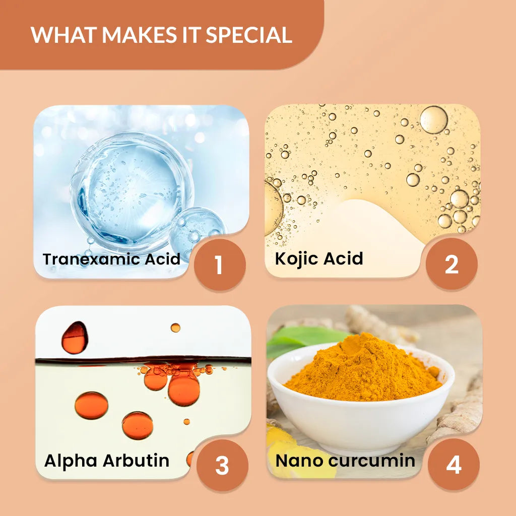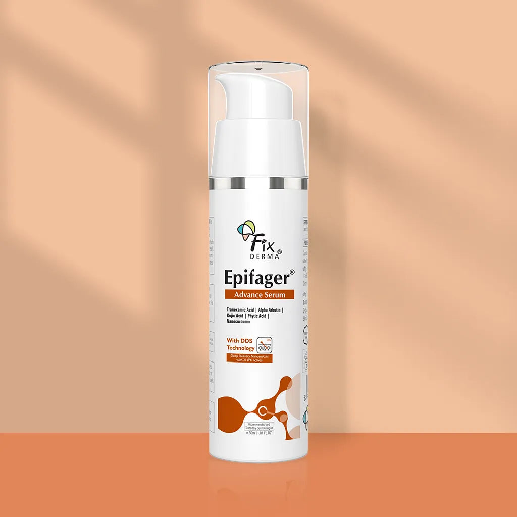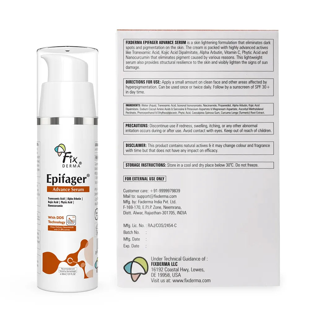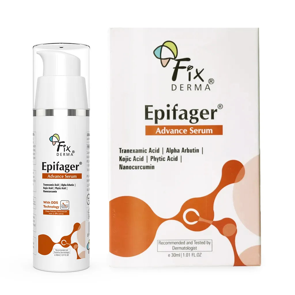 Fixderma Epifager Advance Serum is a potent pigmentation-lightening formulation with Tranexamic Acid, Kojic Acid, Alpha Arbutin, and Nanocurcumin. This lightweight serum targets multiple pathways of melanogenesis, reduces dark spots, and visibly lightens sun damage. Suitable for all skin types, it offers structural resilience, antioxidant protection, and is ideal for long-term, non-comedogenic use.