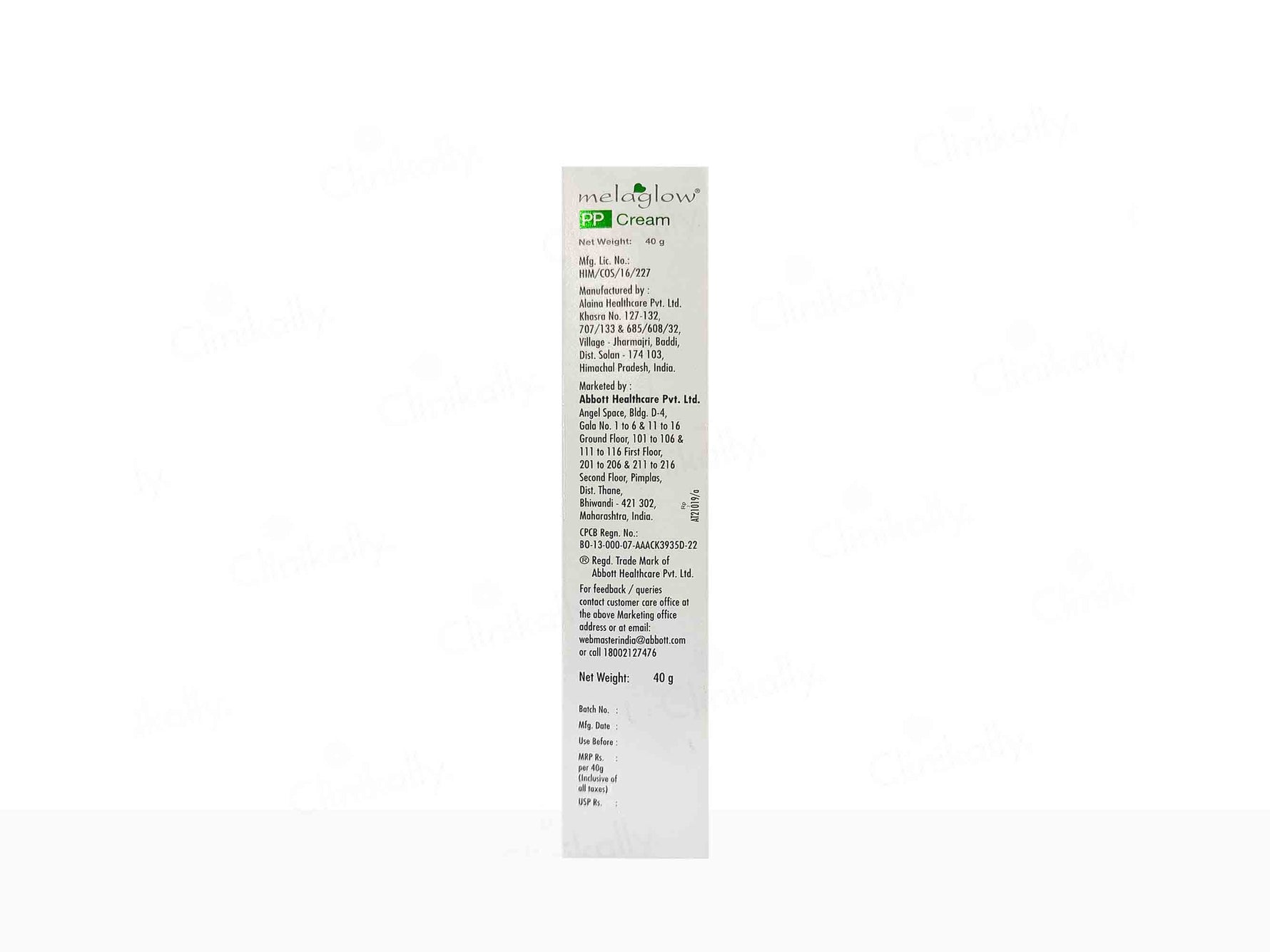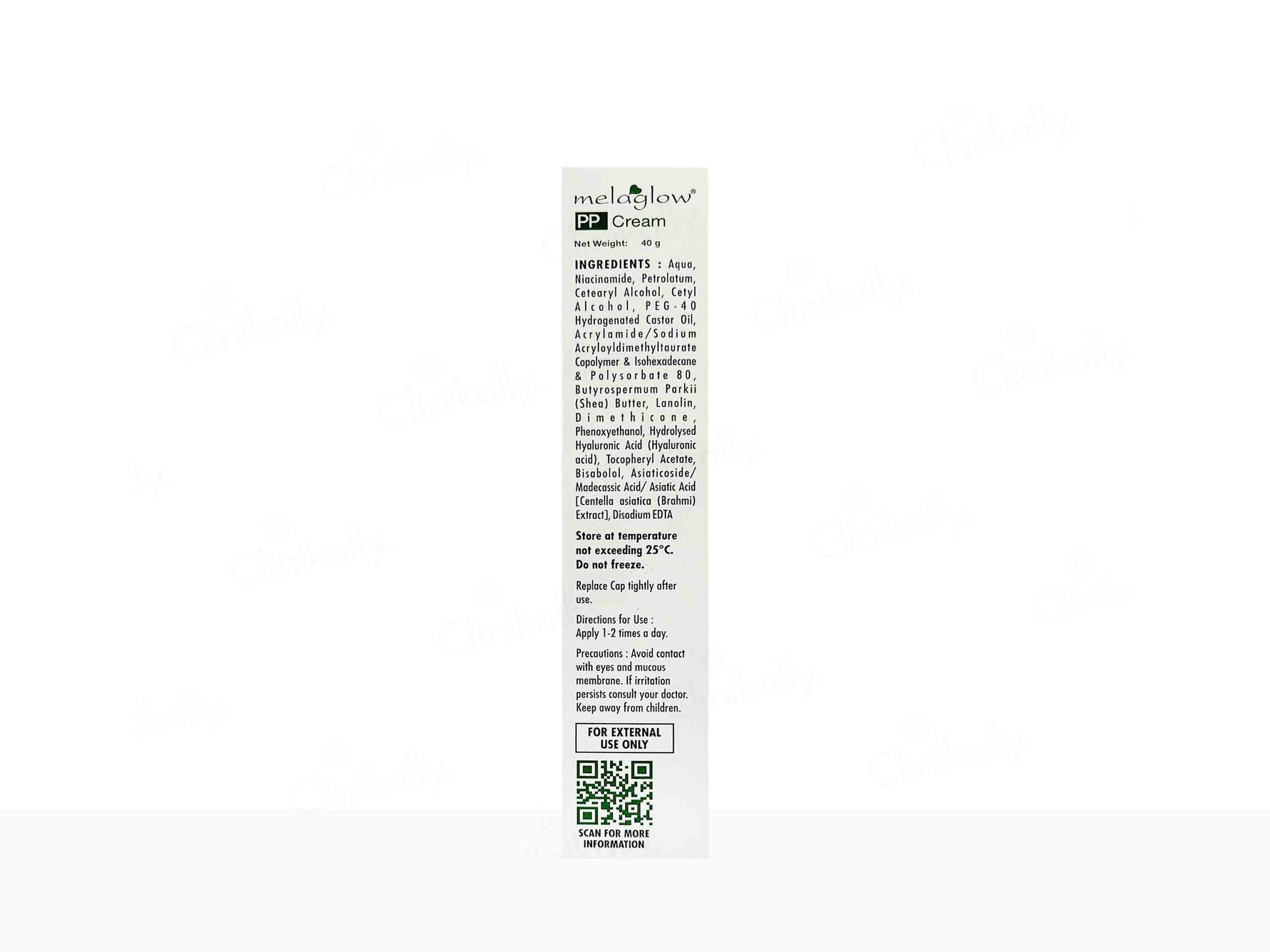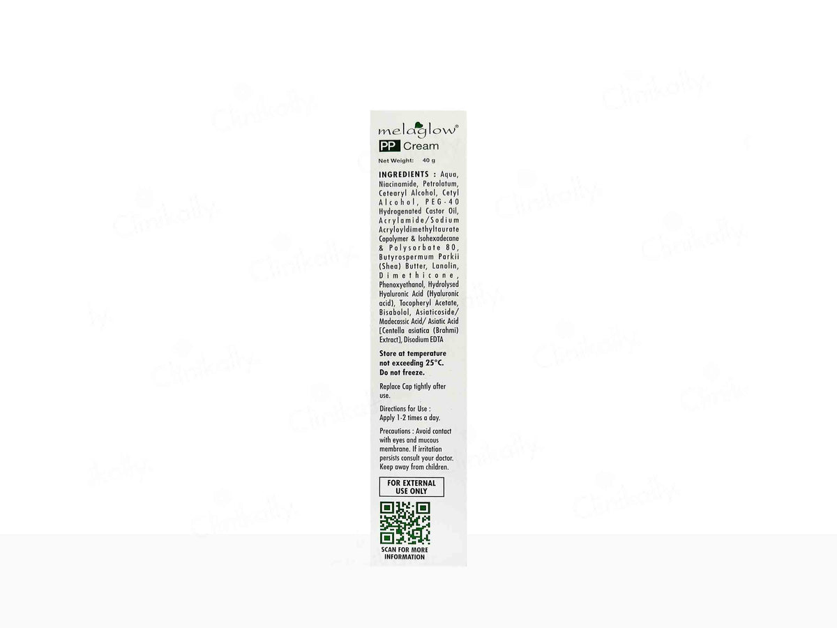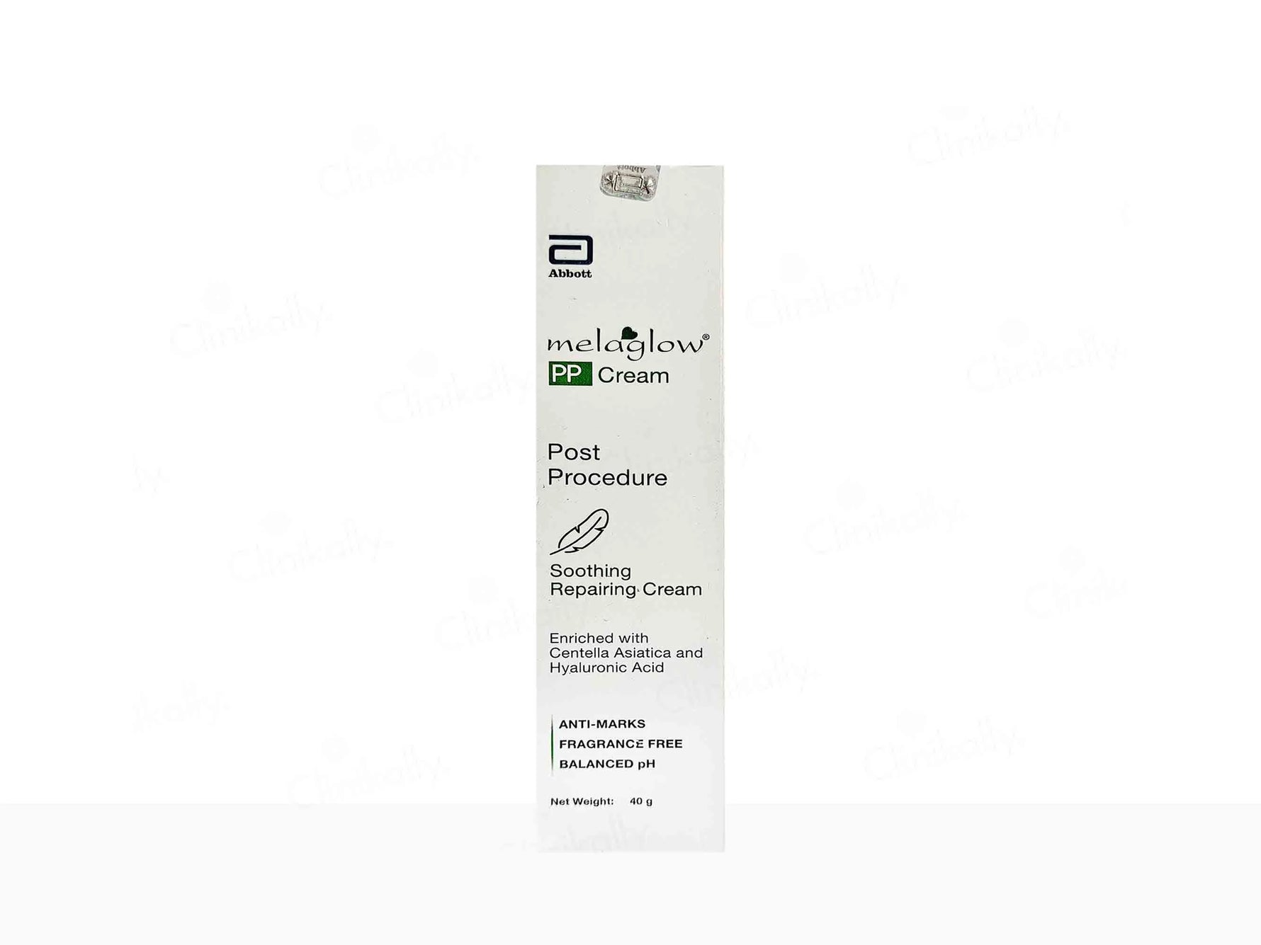 Melaglow PP Cream is a post-procedure soothing and repairing cream formulated to calm irritated skin and accelerate recovery after dermatological treatments. It is enriched with Centella Asiatica (Brahmi Extract), Hyaluronic Acid, Niacinamide, and Shea Butter, which work together to hydrate, soothe, and restore the skin’s protective barrier. The cream also includes Bisabolol, Tocopheryl Acetate, and Lanolin to reduce redness, prevent dryness, and support skin regeneration. Its balanced pH, fragrance-free formula makes it ideal for sensitive or post-treatment skin, helping reduce marks while maintaining softness and comfort with every use.